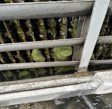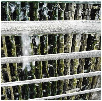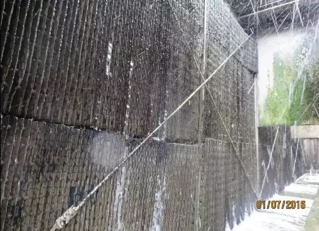 ![]() 水塔內部的填料一側布滿水垢及青苔 |