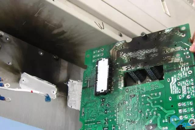 3)。直流變頻器多聯機上電跳閘,2020年元月,接到消息,一臺900多聯機出現上電跳閘,到現場后打開電箱,聞到一股刺鼻的焦糊味,知道情況不妙,與此同時,電箱右邊也看見一大塊電箱被熏黑,圖6是現場照片,與此同時,整流橋已被炸開。隨后通過測表發現IPM變頻器模塊也發生短路,壓縮機無功補償,壓縮機的繞組發生了短路。