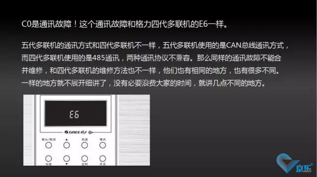 五代機(jī)C0通信故障與四代機(jī)E6一樣,都被稱為通信故障,格力五代機(jī)采用CAN總線通信。但四代機(jī)使用485通信,兩種通信協(xié)議不兼容,則同一通信故障,不能合并維修,不能與四代多聯(lián)機(jī)維修方法不同,它們有許多相同的地方,也有許多不同的地方,同一個(gè)地方我就不展開(kāi)詳細(xì)地論述,不必浪費(fèi)大家的時(shí)間。簡(jiǎn)單說(shuō)說(shuō)與四代機(jī)維修不同之處,供大家參考學(xué)習(xí),互相交流分享。