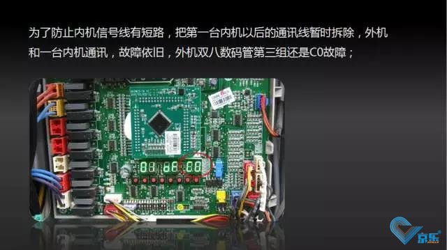 正是五代機(jī)剛剛開(kāi)始在市場(chǎng)上普及,有一家售后單位接到報(bào)修報(bào)告,他們到現(xiàn)場(chǎng)發(fā)現(xiàn),內(nèi)部線控器顯示C0通訊故障,外機(jī)主板三組雙八數(shù)碼管也出現(xiàn)C0故障。要緊的是這臺(tái)多聯(lián)機(jī)就是新的機(jī)器還沒(méi)有調(diào)試,安裝者給用戶拖了一個(gè)月也沒(méi)有解決。客戶是一家商用門面房,用戶急切地等待開(kāi)張,冷氣無(wú)法使用,用戶非常著急,最后用戶向安裝單位投訴,投訴到廠家售后。