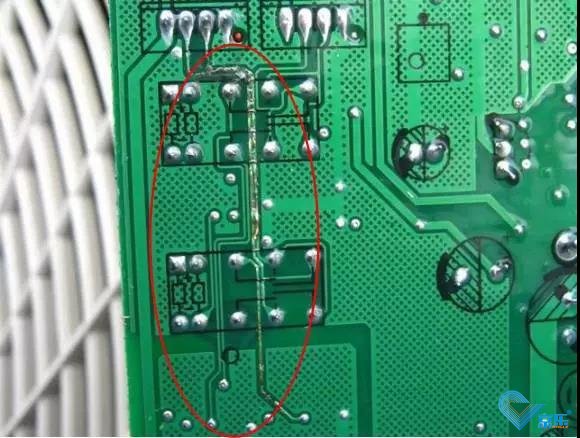 而且主板銅箔條有明顯燒斷的地方,這種情況告訴你什么信息?年長(zhǎng)的維修人員有自己的判斷,這里有強(qiáng)電就會(huì)燒壞主板銅箔條,弱電也不會(huì)燒壞銅箔條。