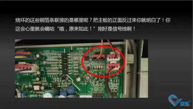 5.燒壞的銅箔,相當(dāng)于什么地方?將主板面翻轉(zhuǎn)過(guò)來(lái),你就會(huì)明白問(wèn)題所在,這里有三條信號(hào)線。一組連接D1.D2線路端,一組連接遠(yuǎn)程通信模塊(GPRS盒),另一組連接壓縮機(jī)驅(qū)動(dòng)板。
