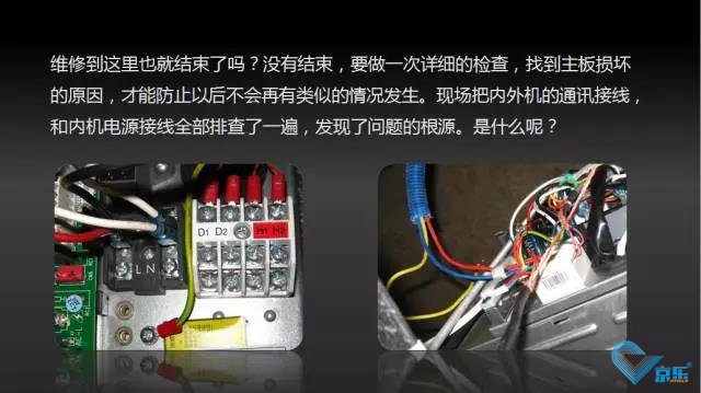 內(nèi)外機(jī)對(duì)內(nèi)、外通訊線路及內(nèi)部電源接線全部檢查一遍,發(fā)現(xiàn)問(wèn)題根源。這個(gè)問(wèn)題的根源在哪里?看看下面的圖表,內(nèi)部?jī)蓚€(gè)接線端,左邊是電源端,右邊是通信端,電源與通信端的距離較近。