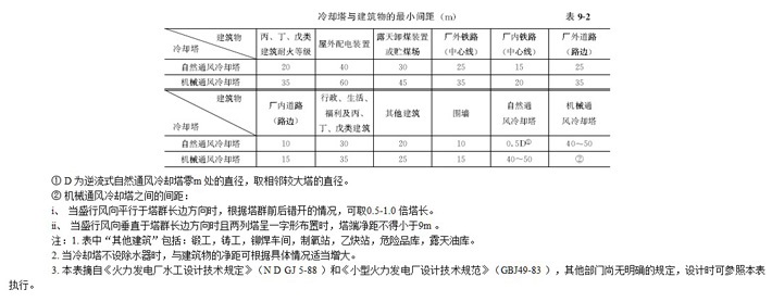 1. 為了避免或減輕飄滴、 霧和噪聲對廠區、 居住區及建筑物的影響,冷卻塔應布置在下風向,并應有適當的距離。冷卻塔間凈距及冷卻塔與附近建筑物的距離應按表9-2 執行,符合表9-2 的規定要求。