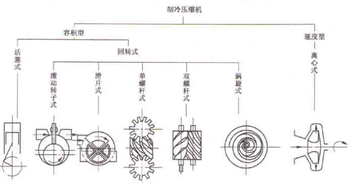 按壓縮機分類。壓縮式冷水機組根據其工作原理即所用壓縮機的種類不同,分為容積型和速度型兩大類,如圈子1所示。其中包括活塞式、螺桿式、離心式和渦旋式冷水機組等。