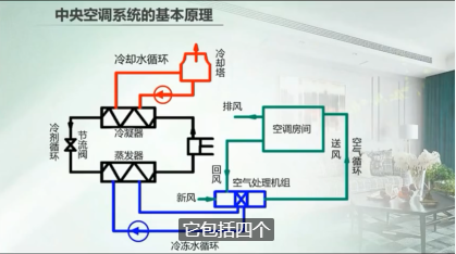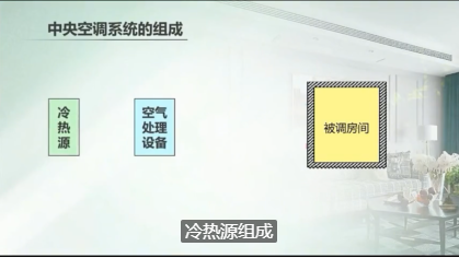 那么中央空調系統它的組成是哪些部分呢?一般呢,一套中央空調系統,它由被調房間空氣的處理設備、冷熱源組成。