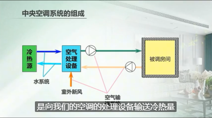 那么室外的新風和室內的回風經過混合以后呢,由空氣處理設備處理到我們需要的塑封狀態,送入空調房間。冷熱源呢?為我們的空氣處理設備提供冷熱量。空氣輸送系統呢,是向房間輸送我們處理好的空氣。水系統呢,是像我們的空調的處理設備,輸送冷熱涼。在空調房間內呢,由空氣的分配裝置把我們的空氣按照一定的氣流組織送到我們的空調區域。那在這里邊呢,