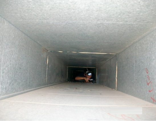 中央空調管道清洗方法8、接好吸塵箱的吸管,開啟吸塵箱,使管道內部處于負壓狀態,進一步杜絕污染物外泄的可能。制造氣流,吸收管道內的污物。同時將清潔機器人放入清洗的中央空調風管內進行清掃作業,由近而遠清掃風管內壁,清掃時使刷頭或機器人沿作業口進入管道,剝離管道內壁附著污染物,使其可以被吸塵器制造的氣流輸送到吸塵器并被吸收。通過監視的攝像單元可從顯示器上看到風管內部的清洗及設備的工作情況,以便通過操作按鈕控制機器人手臂升降高度、滾筒刷及行進的方向。整個風管的清洗過程進行錄像并填寫一些相關記錄。