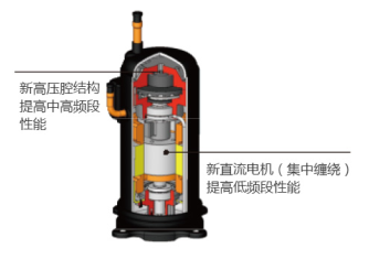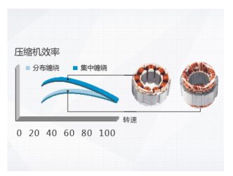 采用高效率永磁同步電動機,轉子為永磁鐵,定子為集中纏繞,比普通的直流變頻壓縮機效率更高