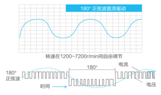 180度電流輸出波形為平滑的正弦波,諧波含量小,轉矩脈動小,調整范圍廣運行平穩節能更舒適,振動噪音更小。