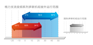 室外機制冷運行范圍為-5~30攝氏度,制熱范圍為-20~24攝氏度,相比國際多聯機組運行范圍-7~43攝氏度,大大拓寬了使用范圍
